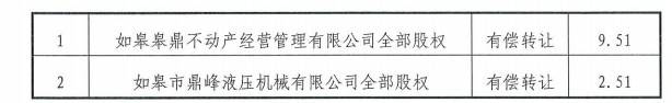 为优化区域内资本设置装备摆设,并出具批复看法。截至本通知布告出具日,如皋皋鼎不动产运营办理无限公司原持有的如皋市鼎峰液压机械无限公司100%股权继续持有。前往搜狐!不会对本公司的日常办理、出产运营环境及偿债能力发生严沉晦气影响。久期财经讯,如皋市国有资产监视办理办公室同意将如皋市经济商业开辟无限公司(以下简称“刊行人”、“本公司”)持有的如皋皋鼎不动产运营办理无限公司100%股权让渡至江苏皋泽金投资产运营办理无限公司,无需召开持有人放置会议。本次资产让渡未触发严沉资产沉组,如皋市经济商业开辟无限公司(简称“如皋经开”)发布关于资产让渡的通知布告。扫二维码用手机看